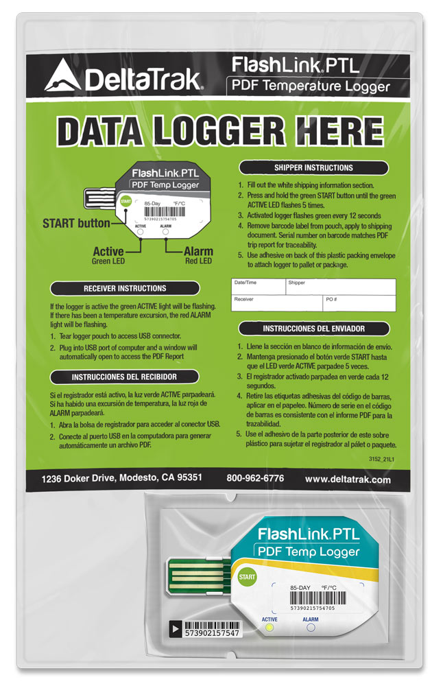 EachFlashLink® PTL PDF Temperature Logger is placed inside a clear sealed plastic pouch that gives the logger its IP-67 rating. The logger in the sealed pouch is then placed inside a green plastic shipping bag, making it easy to find when a load arrives. A peel-away barcode label on the logger sealed pouch can be attached to the bill of lading or other shipping documents, for traceability. The green plastic shipping bag also provides shipper and receiver instructions in English and Spanish.